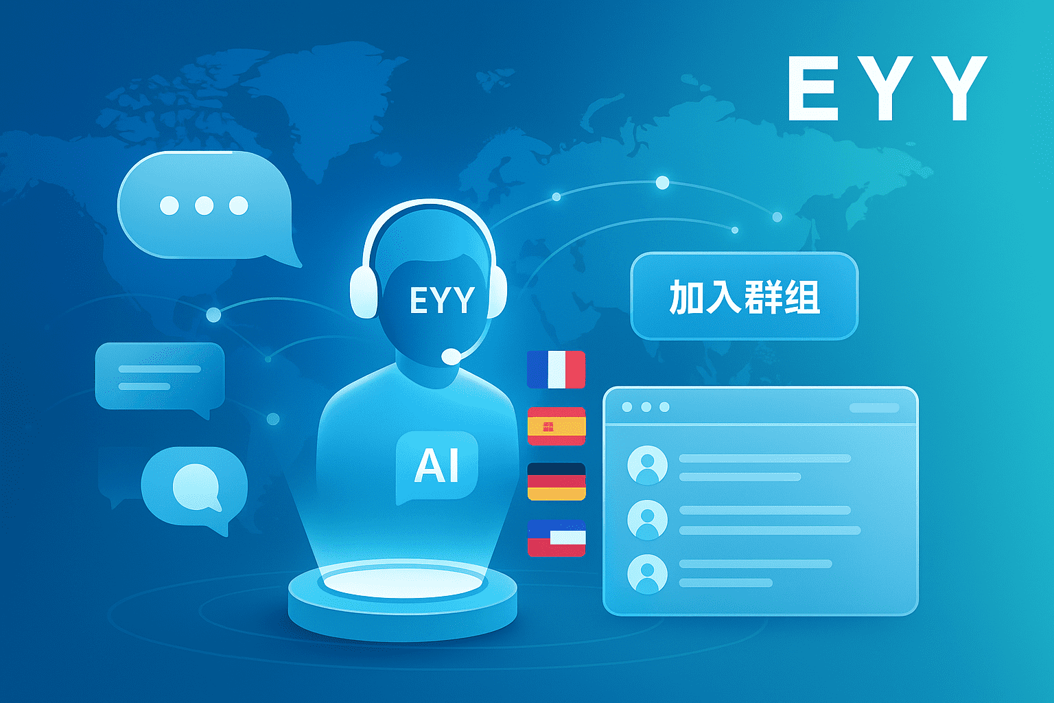 一位电商客服在未来感的科技界面中处理海量消息气泡(微信、QQ、WhatsApp、Telegram 等),使用易歪歪工具统一收件箱,提高聊天效率。